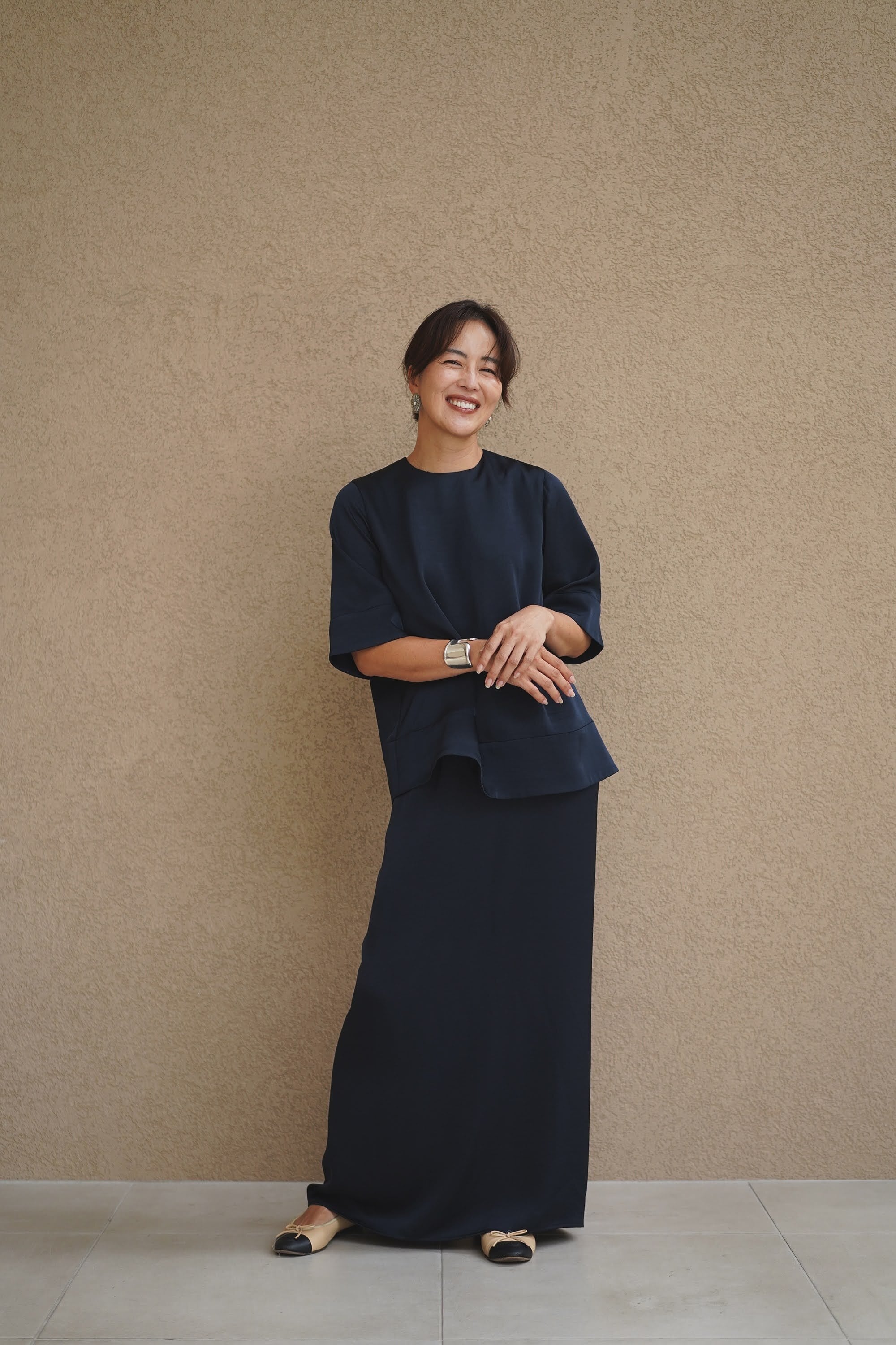 しっとりとした落ち感と、動くたびに優しく光をまとったような光沢感。肌に触れるとつるりと滑らかで、気持ちまでエレガントに。上品さと華やかさが共存する素材が、日常をより豊かに彩ります。