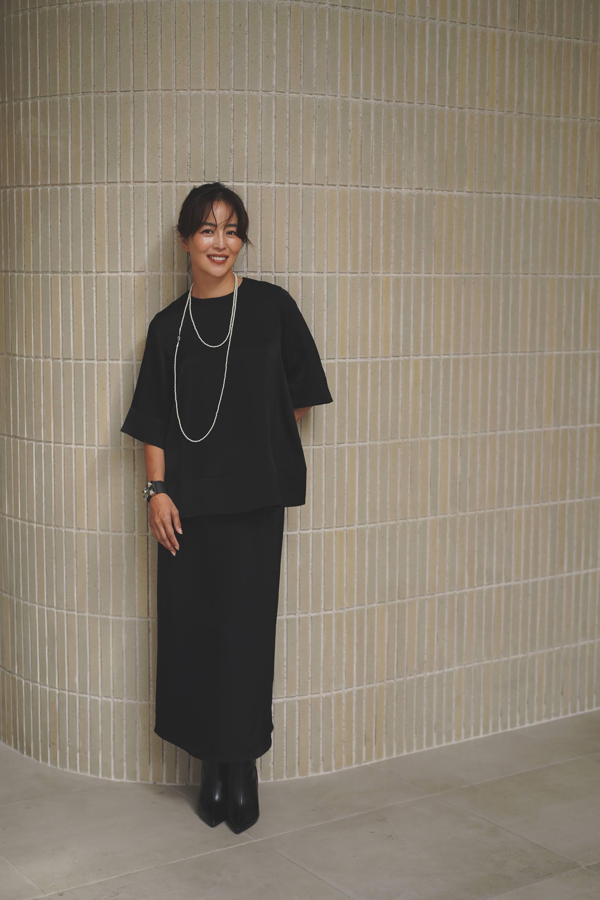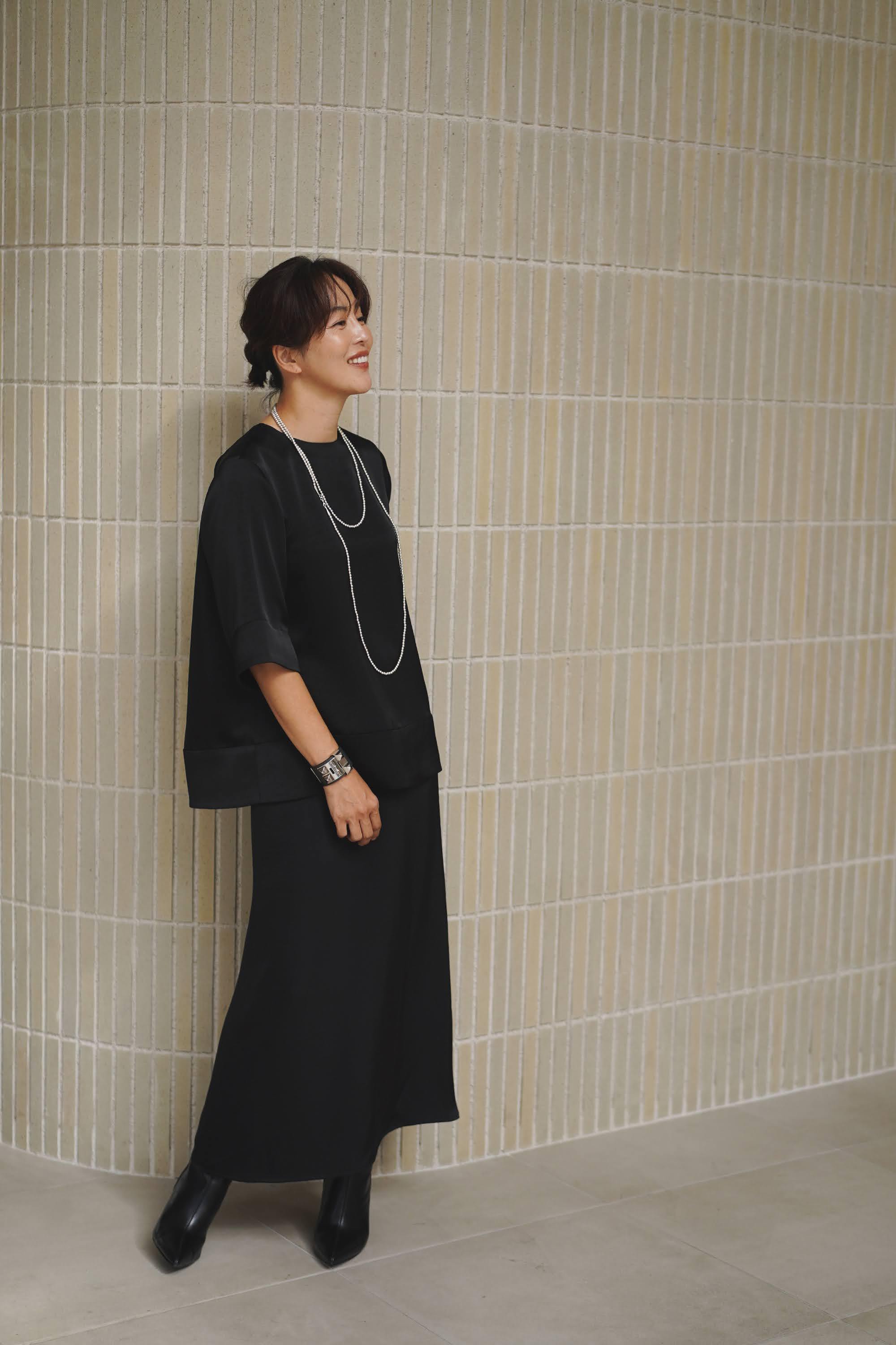 しっとりとした落ち感と、動くたびに優しく光をまとったような光沢感。肌に触れるとつるりと滑らかで、気持ちまでエレガントに。上品さと華やかさが共存する素材が、日常をより豊かに彩ります。