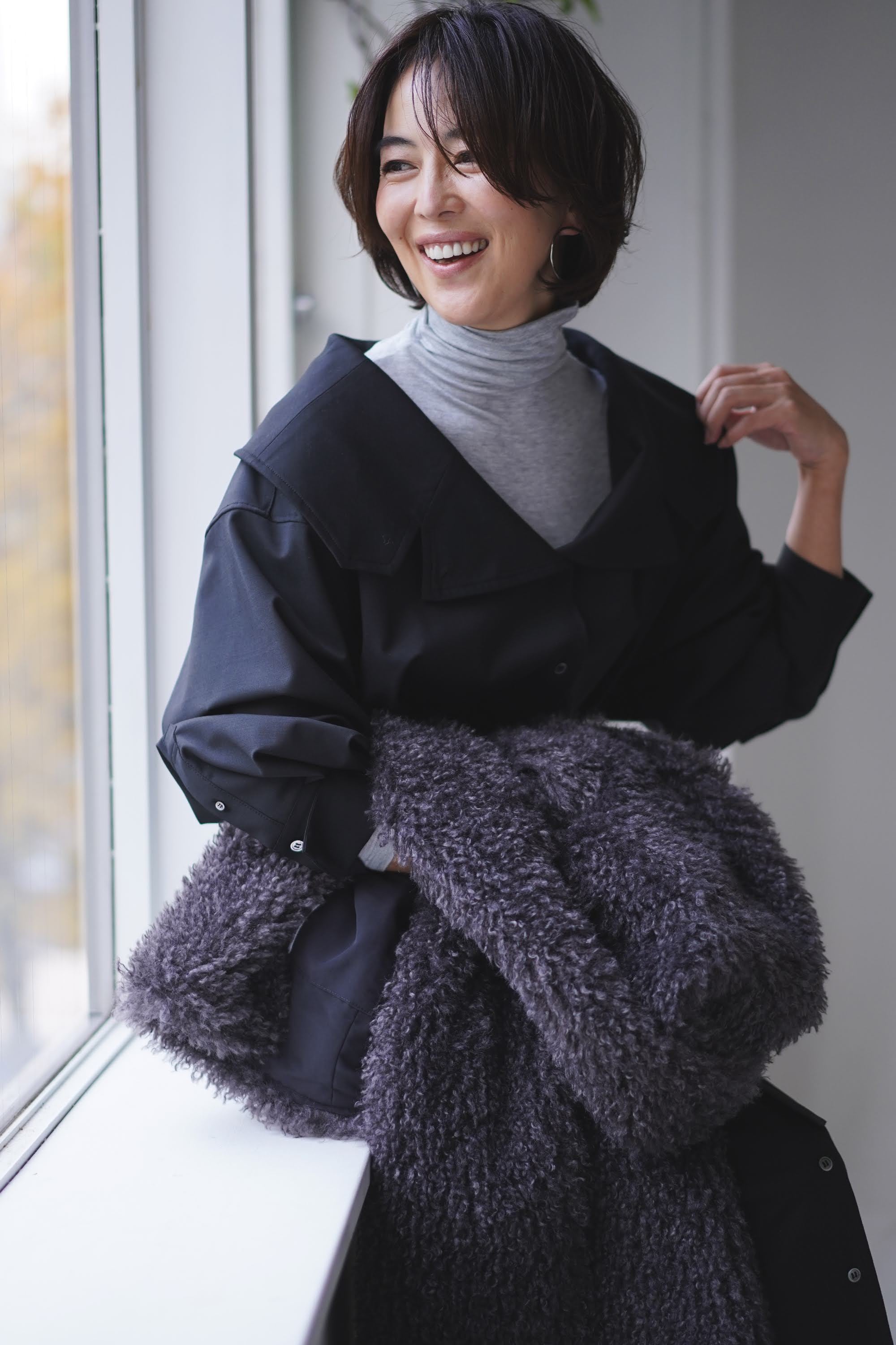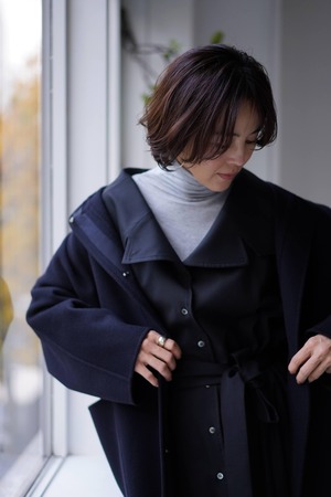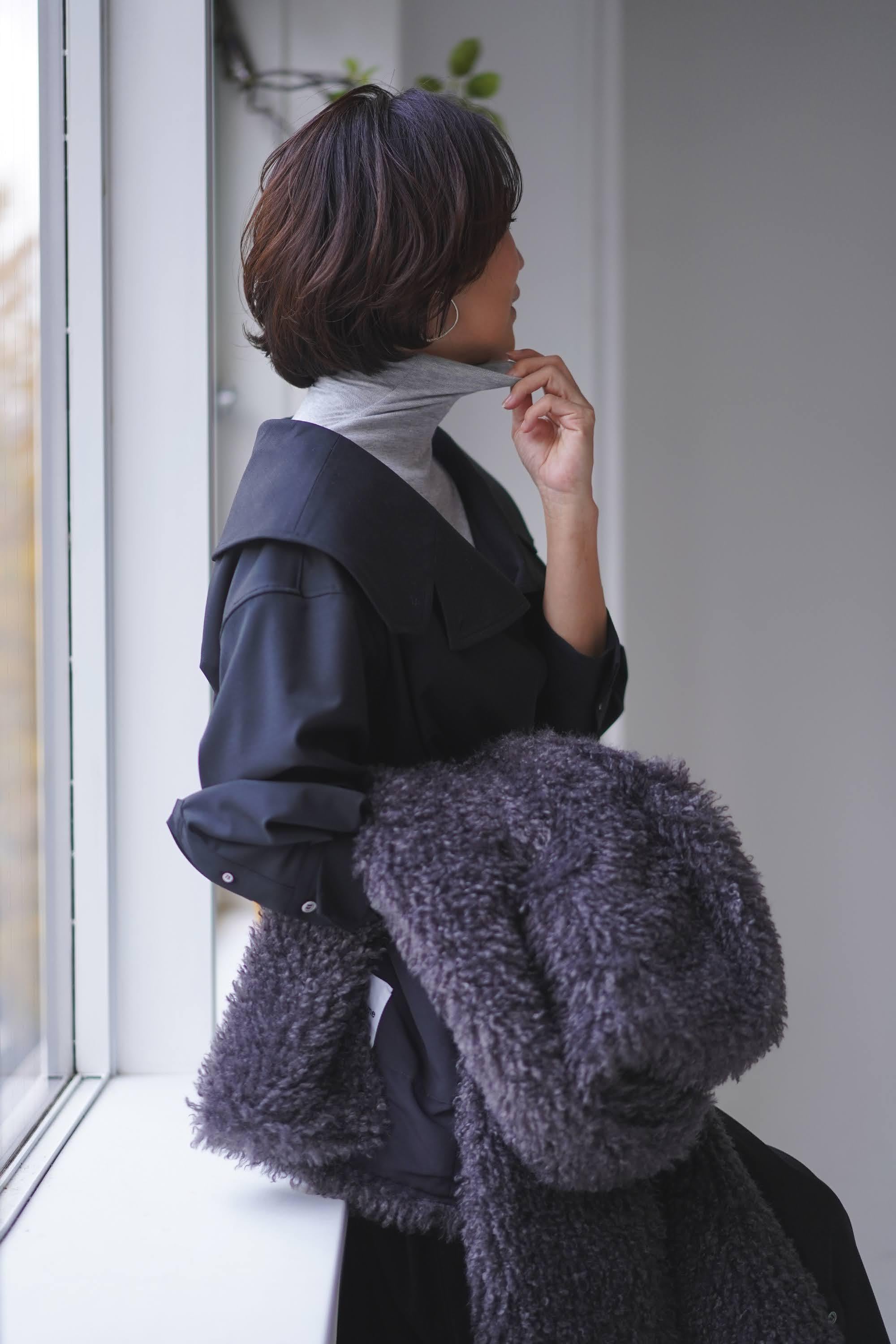 ③さらにその襟をグッと立てれば、一気にマニッシュな雰囲気。メンズライクなトレンチコートの様にクールな表情に変わります。