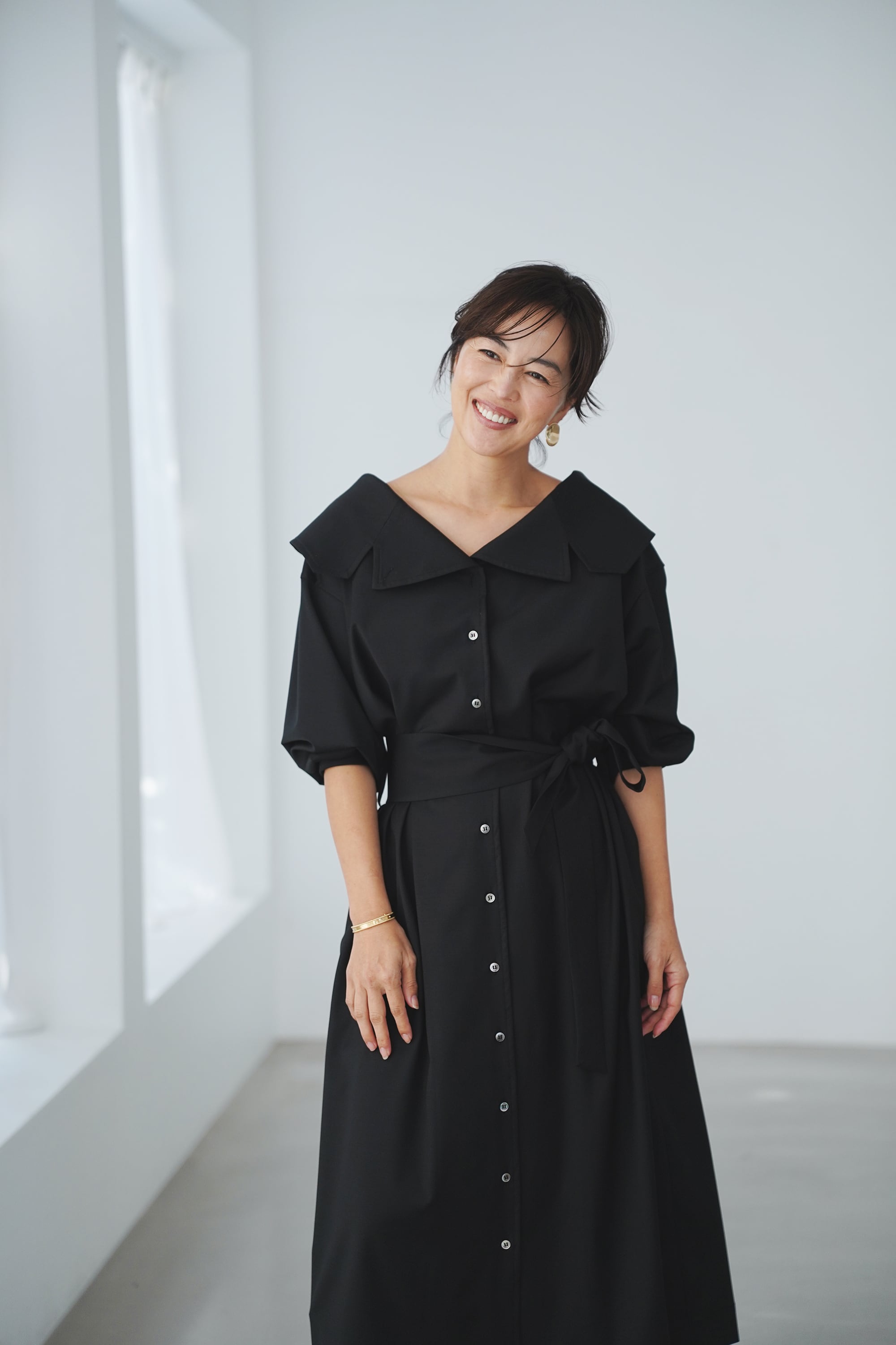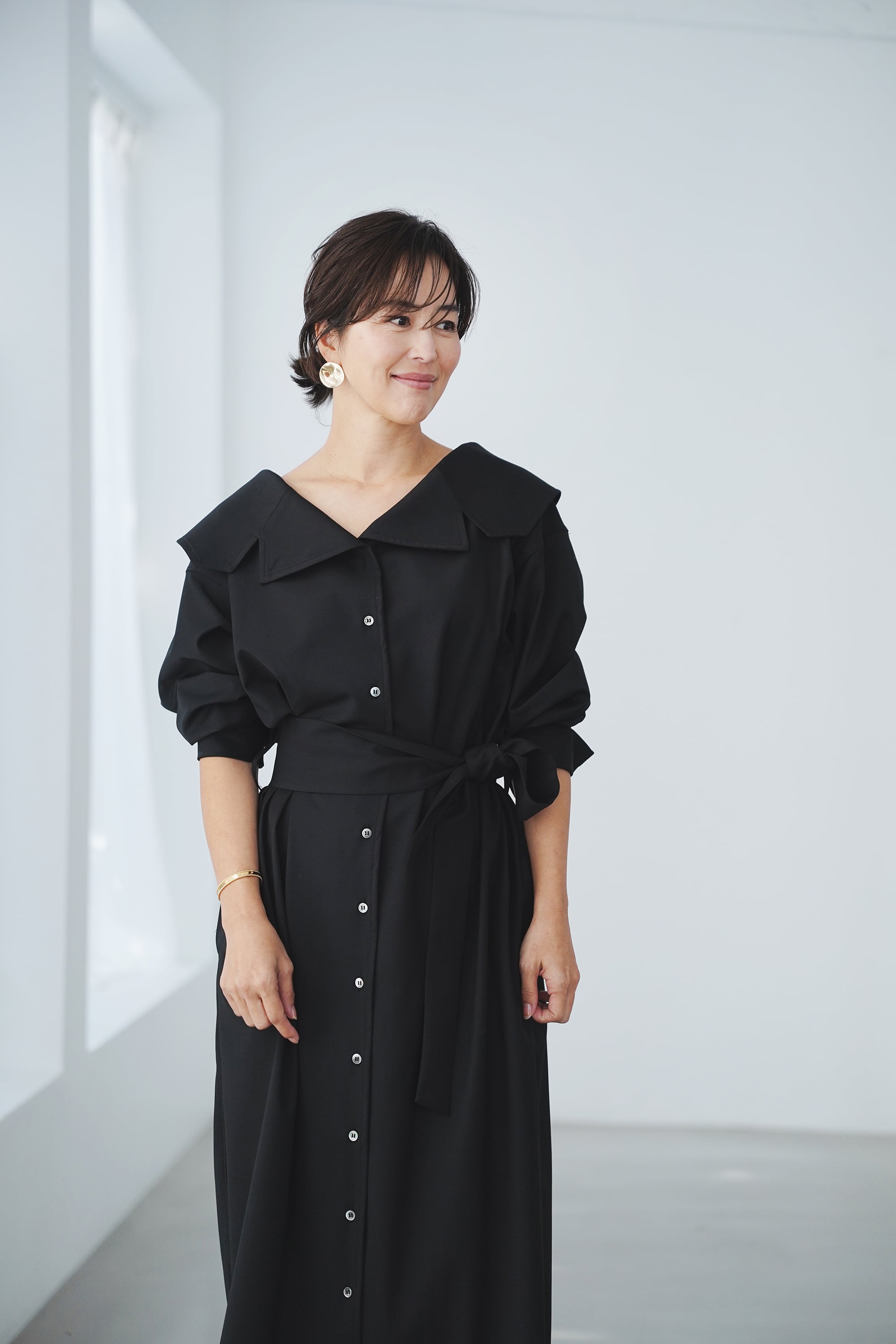 ②その襟をクルッと折って少し大きめのショールカラーに。ブラウスのような可愛らしさと、クラシックさを兼ね備えた着こなしに。