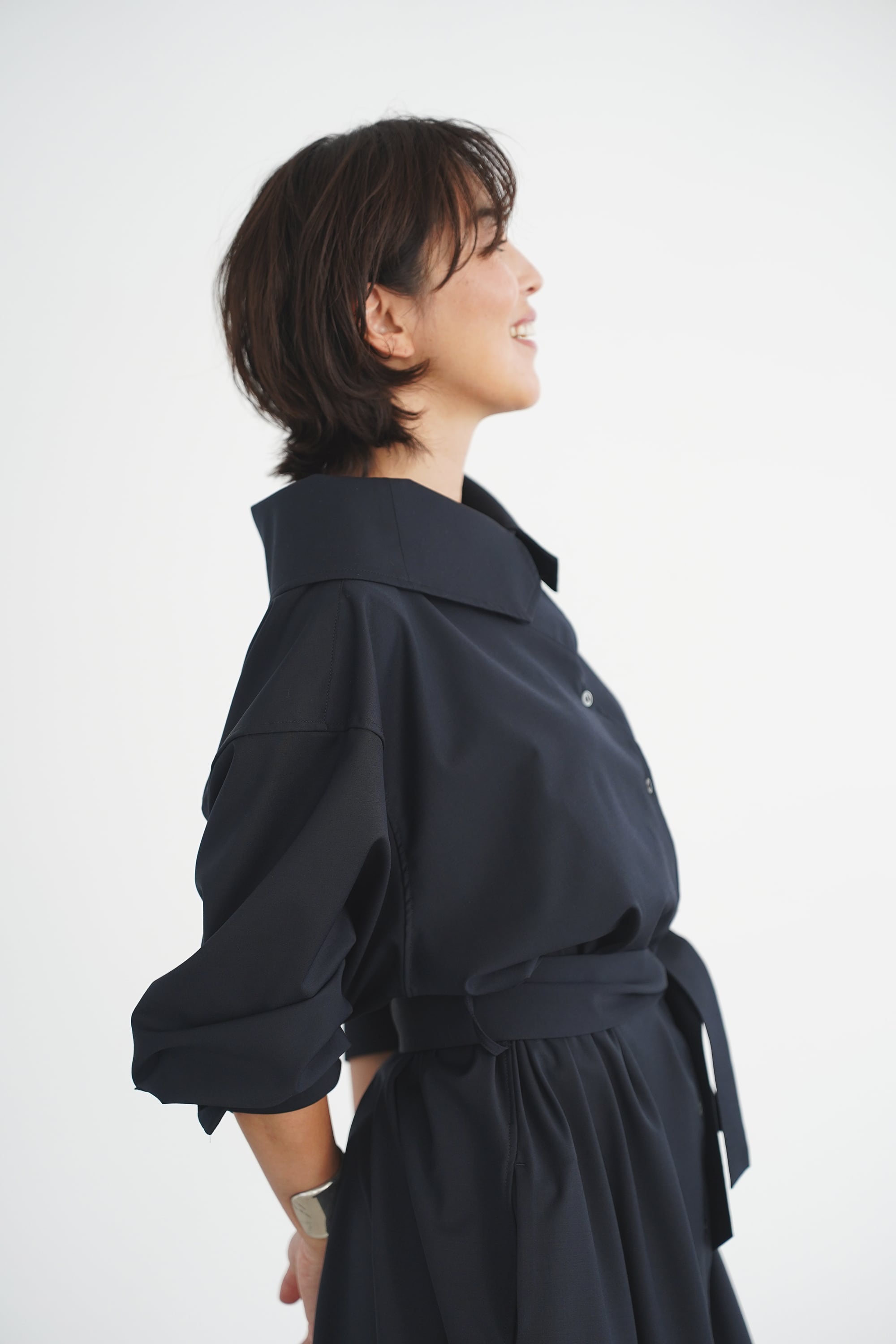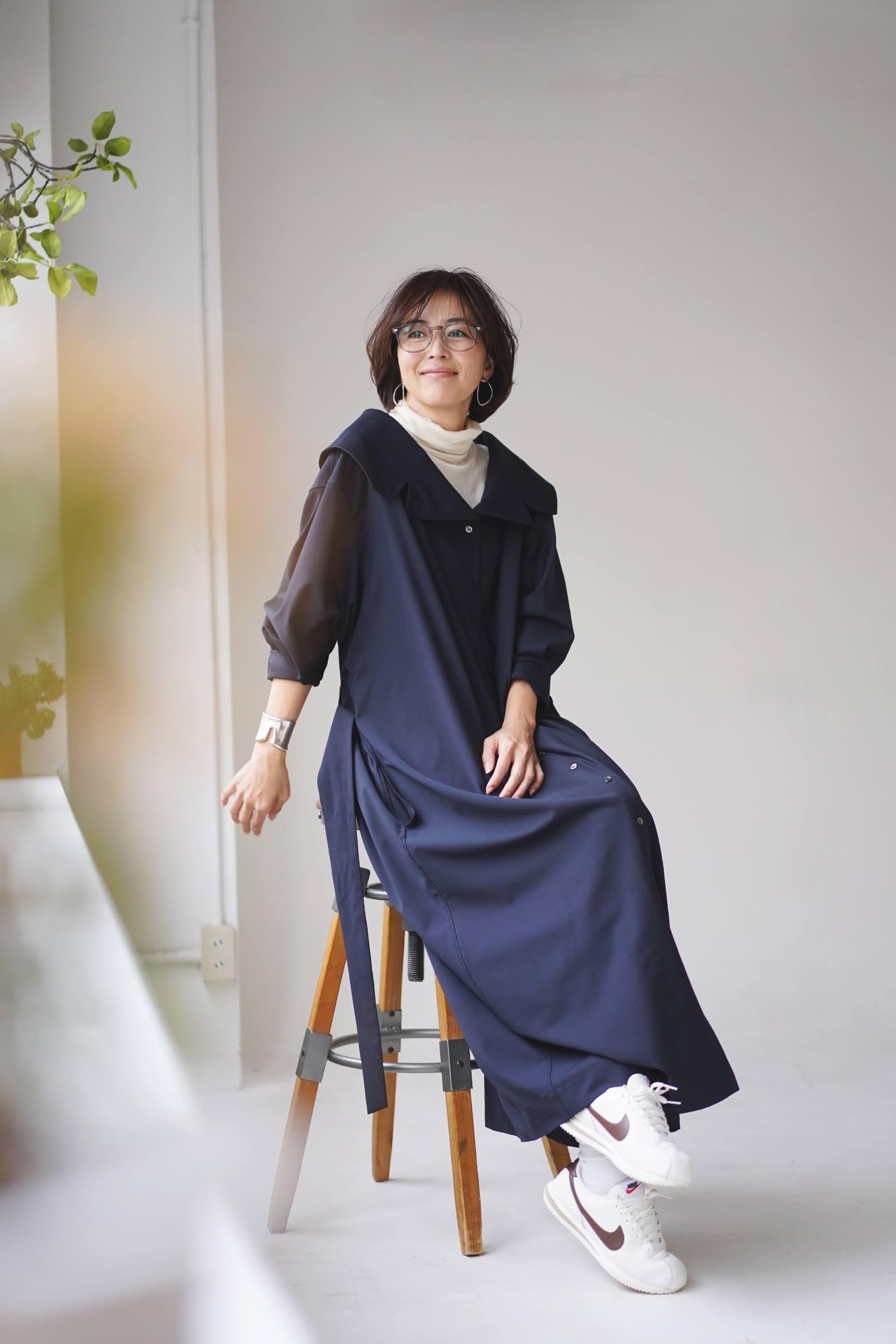 ②その襟をクルッと折って少し大きめのショールカラーに。ブラウスのような可愛らしさと、クラシックさを兼ね備えた着こなしに。