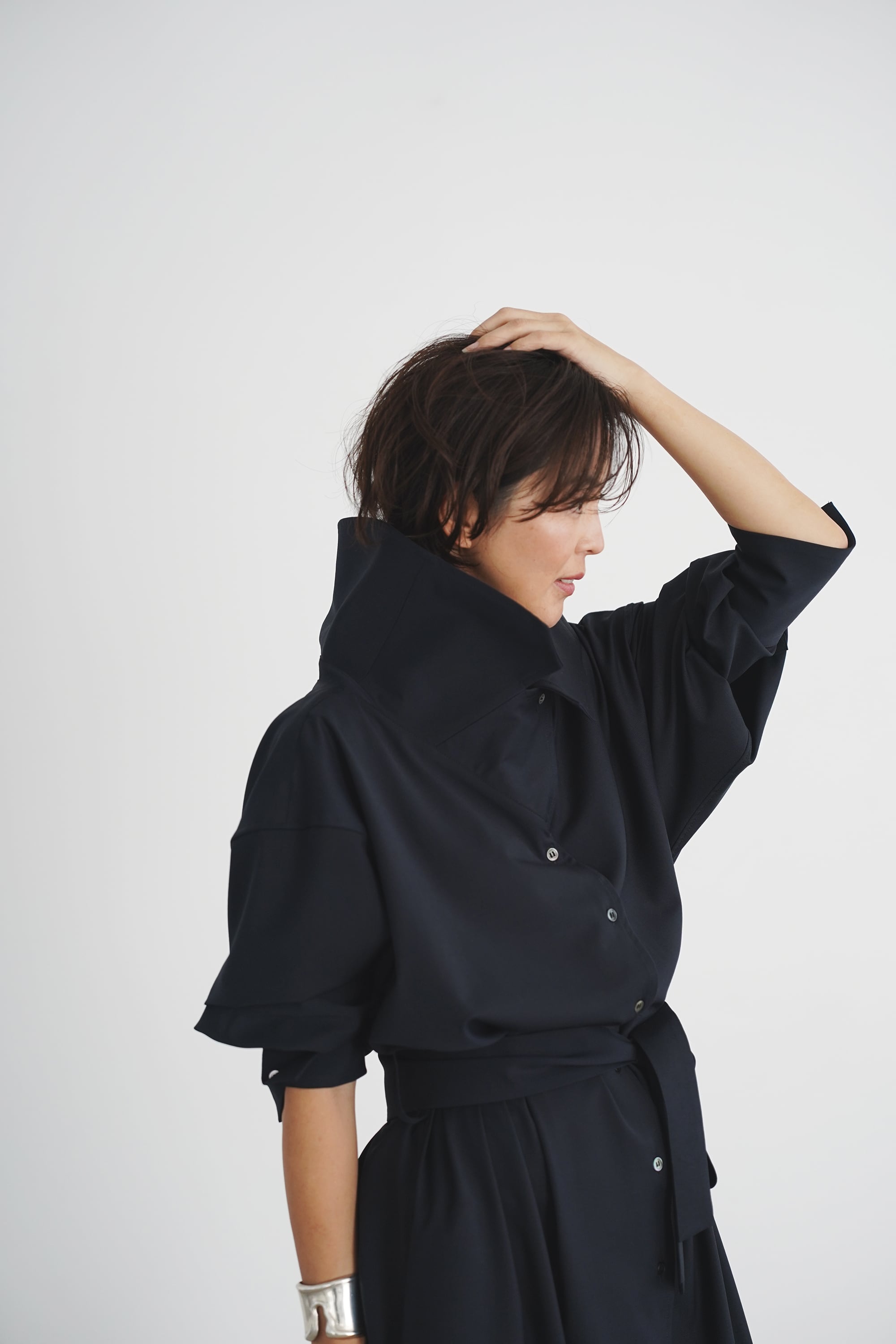 ①まず大きなカラーをガッと開いてデコルテ、肩周りを美しく魅せる着こなし。襟が少し後ろに抜けるように仕上げてあり抜け感も演出します。