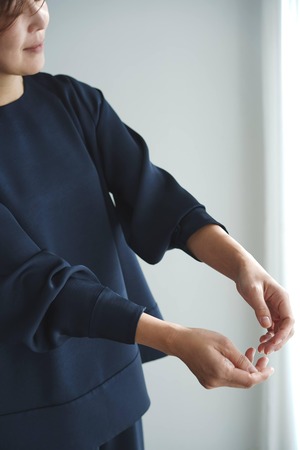 ゆったりと広めにとった袖口は、そのままの着用にプラスして