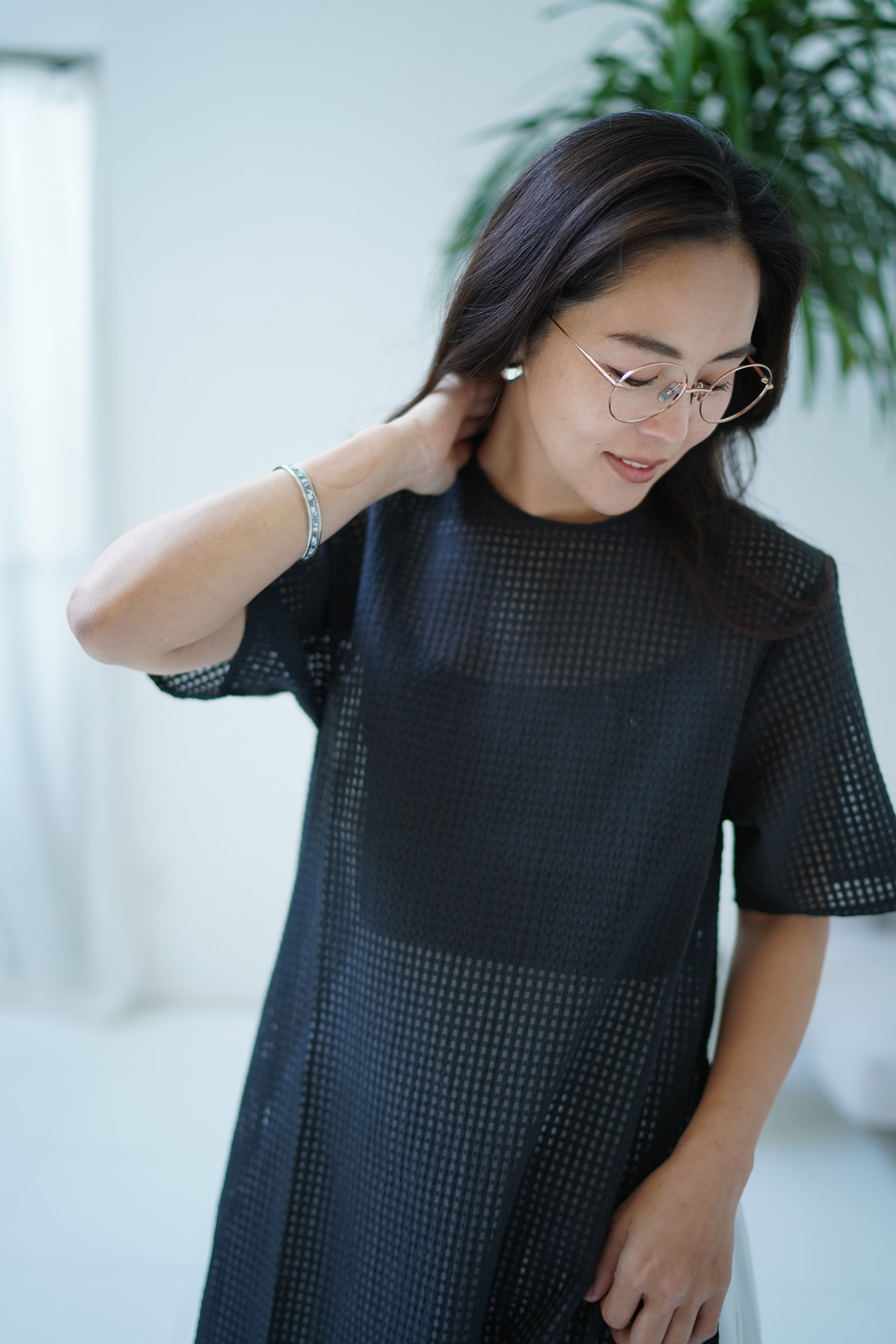 メッシュとリボンが織り合わさった美しい生地は、大人が抵抗なく着られる透け感なので、