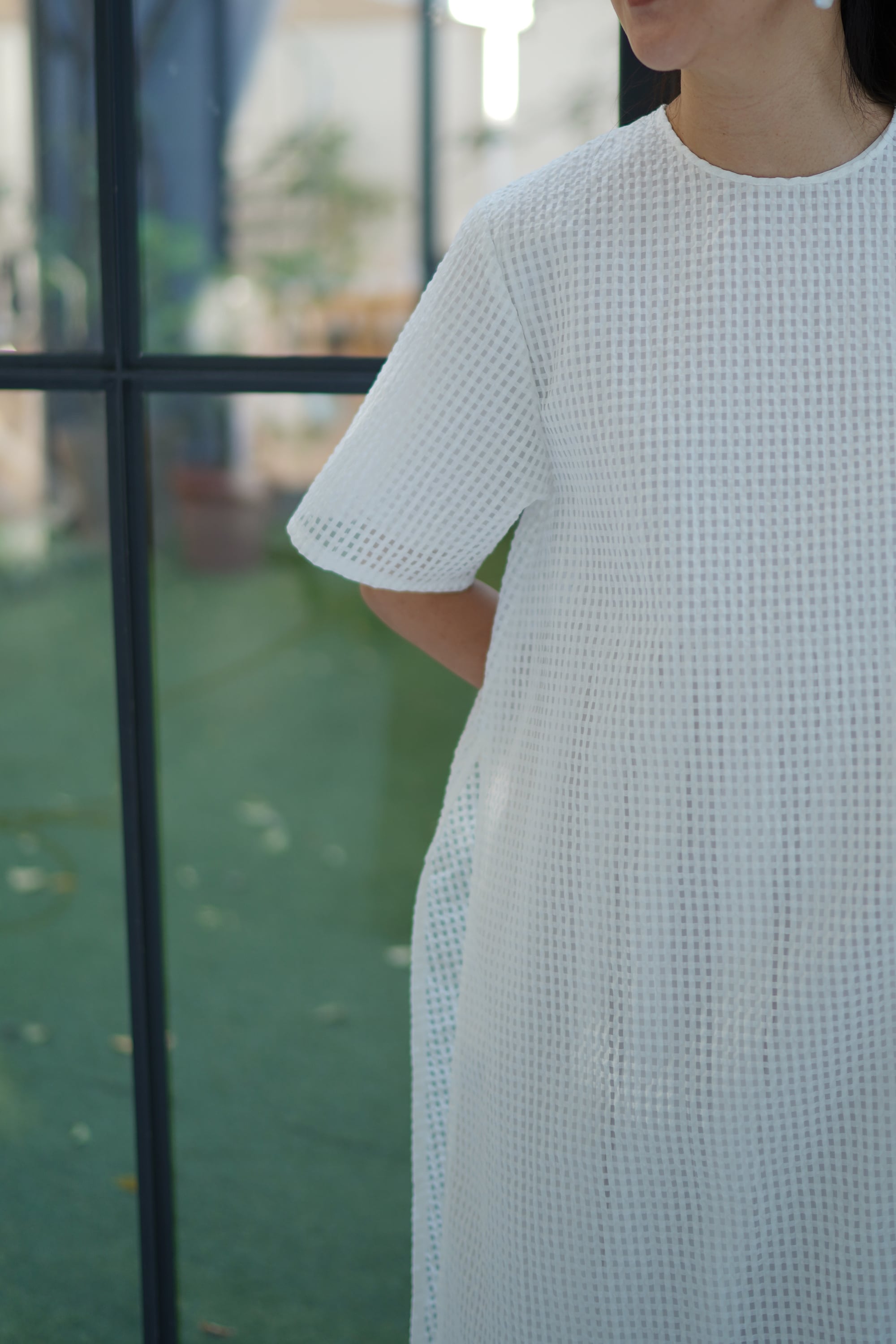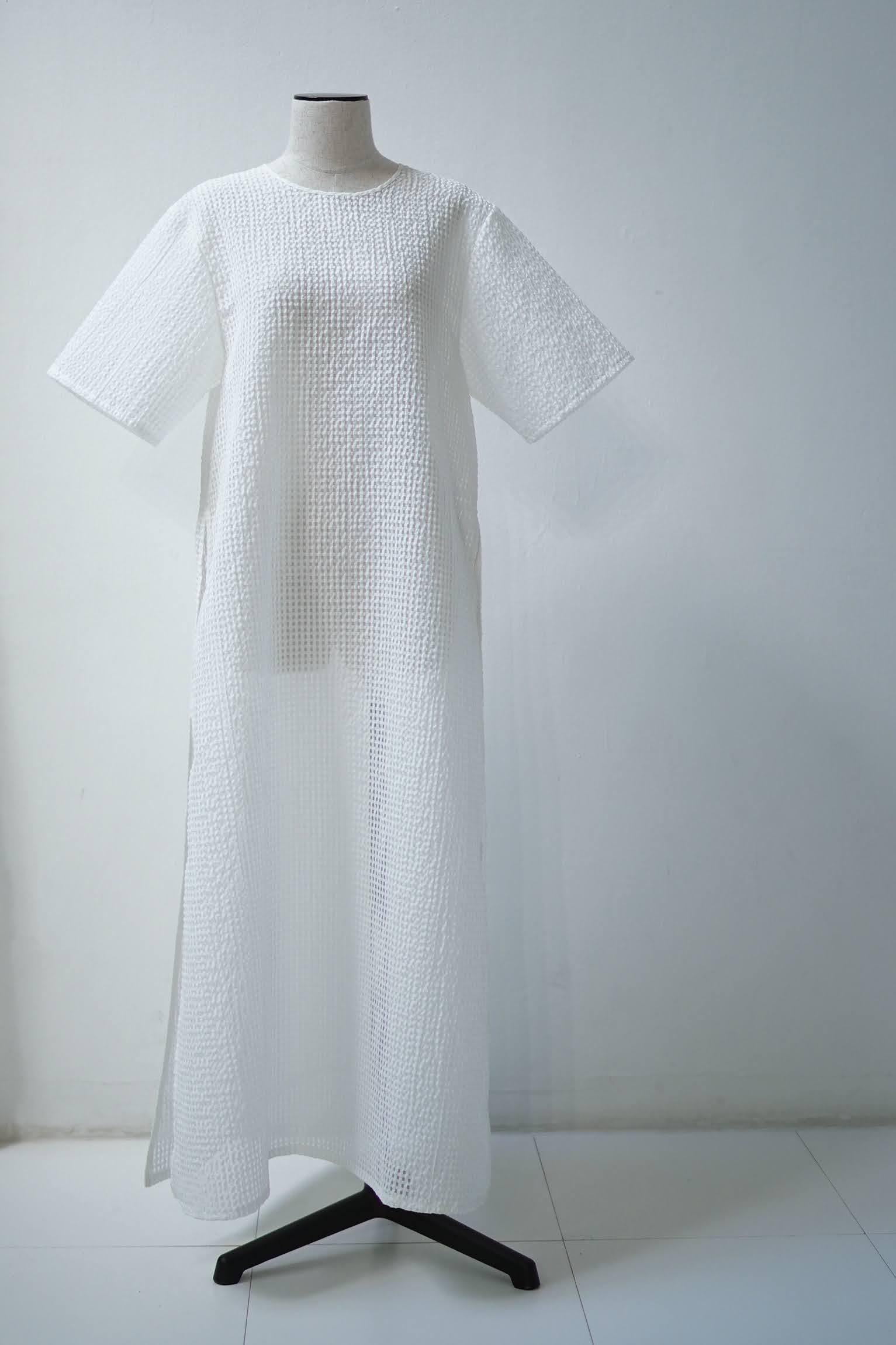 メッシュとリボンが織り合わさった美しい生地は、大人が抵抗なく着られる透け感なので、